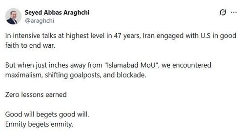 «В ходе интенсивных переговоров на высшем уровне, первых за последние 47 лет, Иран добросовестно взаимодействовал с США с целью положить конец войне. Но когда до подписания «Исламабадского меморандума о взаимопонимании» оставалось буквально несколько шагов, мы столкнулись с максимализмом, постоянным изменением условий и блокадой. Никаких уроков не извлечено. Доброжелательность порождает доброжелательность. Вражда порождает вражду», — подчеркнул Арагчи.