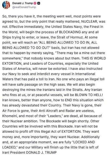С этого момента ВМС США, лучшие в мире, начнут БЛОКИРОВКУ всех без исключения судов, которые будут пытаться войти в пролив Ормуз или выйти из него.