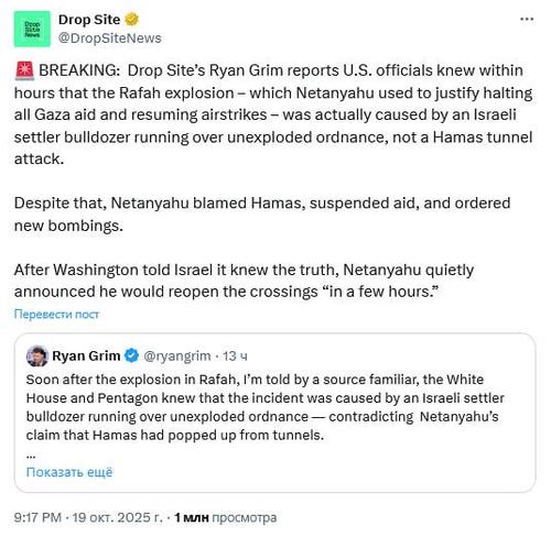Независимое расследовательское СМИ Drop Site News сообщает, что официальные лица США уже через несколько часов узнали, что взрыв в Рафахе, который Нетаньяху использовал для оправдания прекращения всей помощи Газе и возобновления авиаударов, на самом деле был вызван наездом израильского бульдозера поселенцев на неразорвавшиеся боеприпасы, а не атакой ХАМАС на туннель.